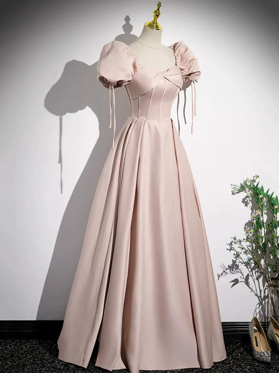 Pink Satin A-Line Floor Length Prom Dress, Off Shoulder Short Sleeve Evening Dress HZ1024