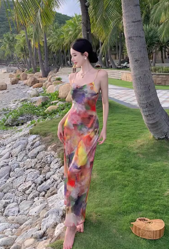 Simple New Painting Style Floral Design Elegant Beach Holiday Spaghetti Strap Dress HZ1024