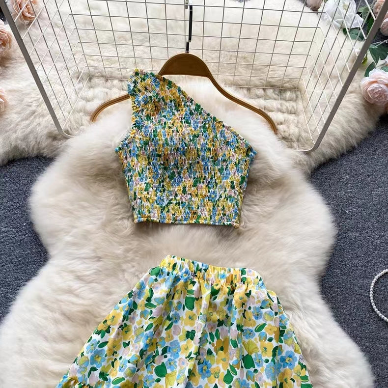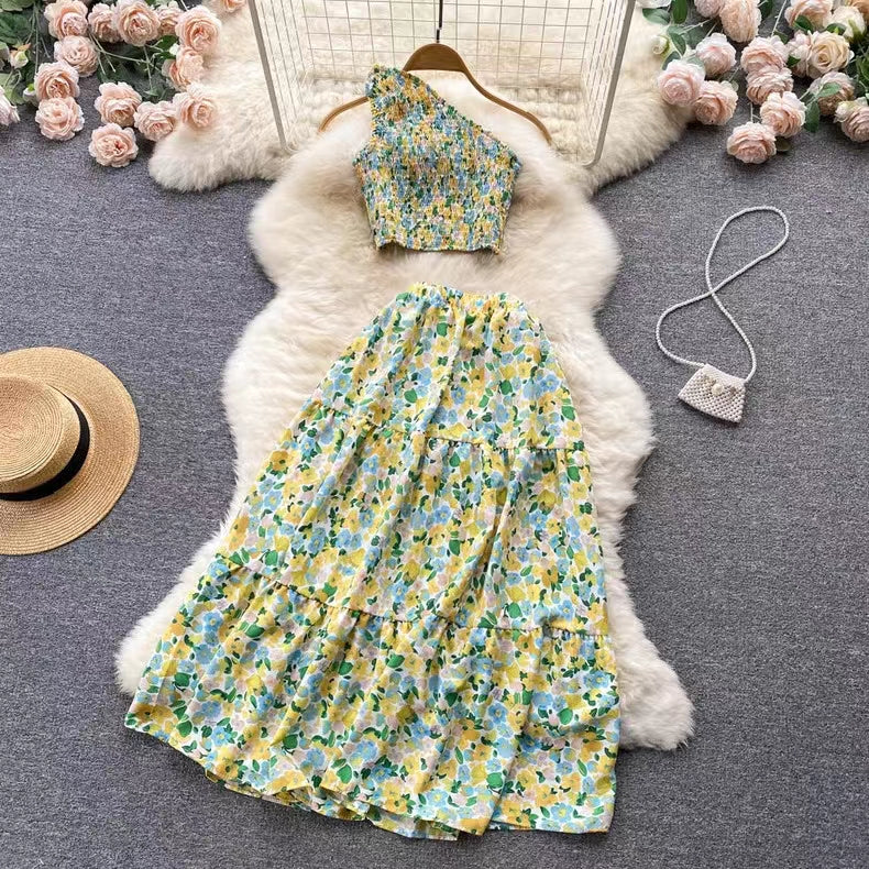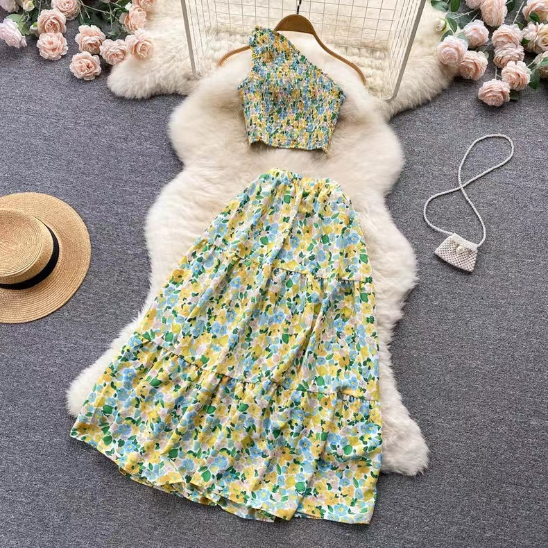 New Seaside Holiday Fashion Short Sleeveless Top High Waist Floral Skirt Two-piece Set HZ1024