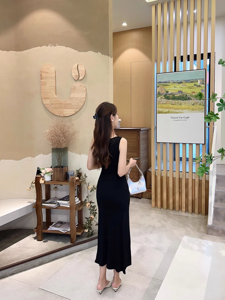 New Fashion Black Sleeveless Elegant Split Spaghetti Strap Dress HZ1024