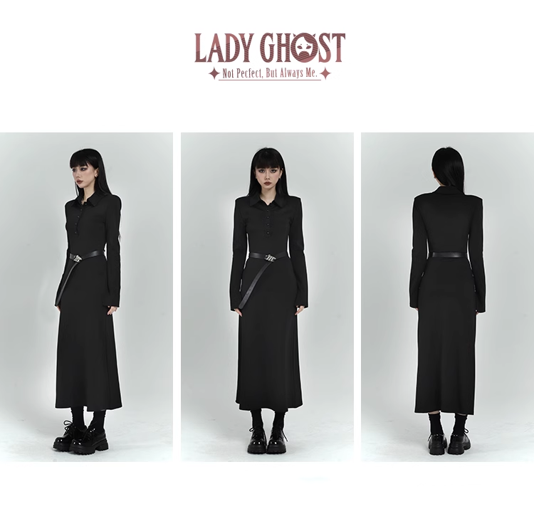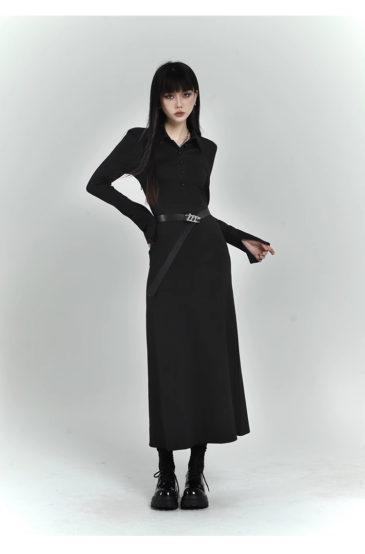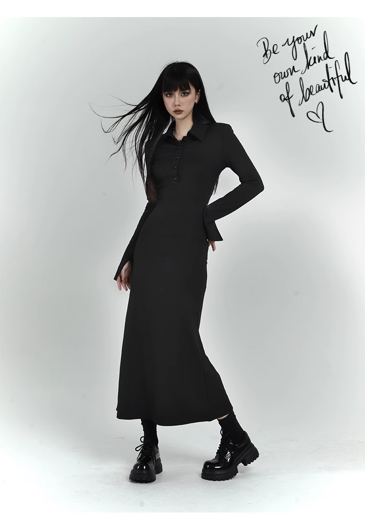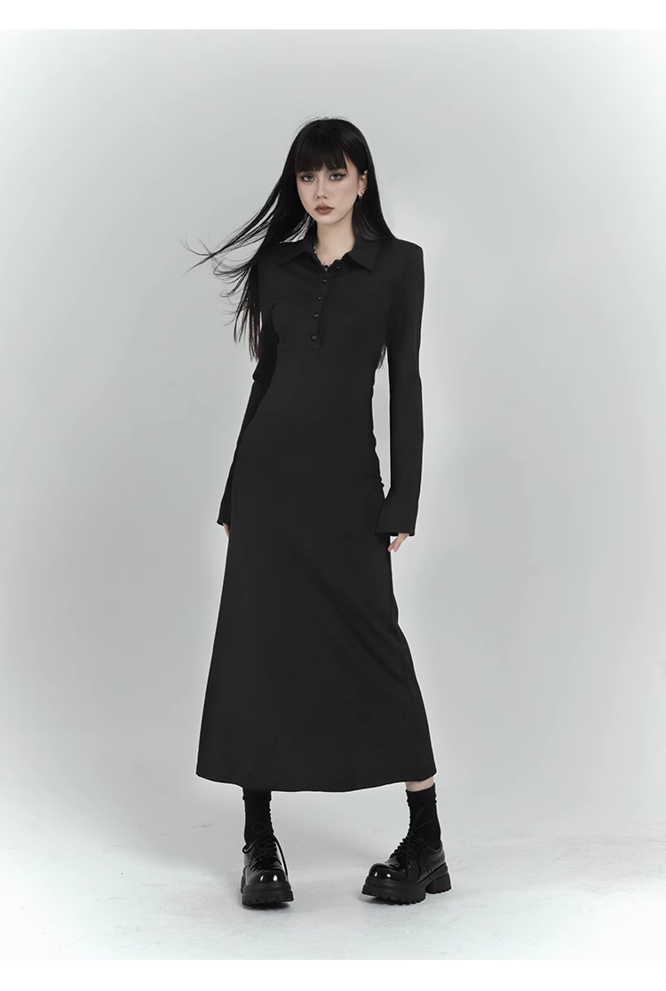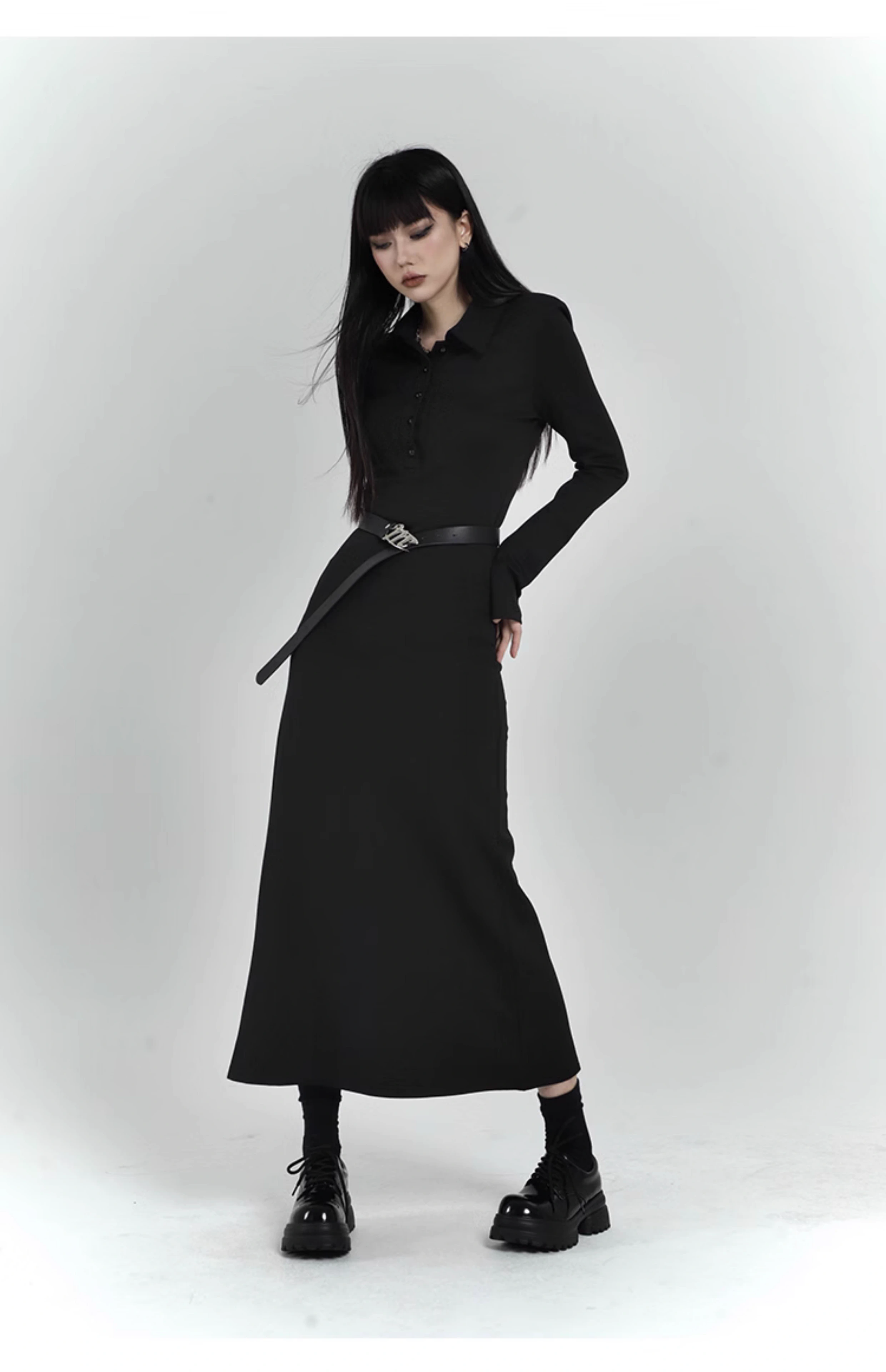 New Fashion Design POLO Style Women Black Long-sleeved Dress HZ1024