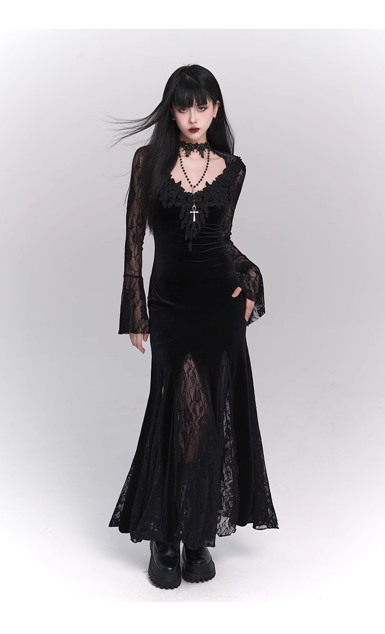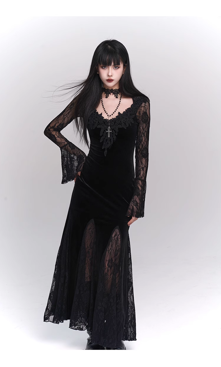 New Ladies Fashion Red Black Gothic Long-sleeved Dress HZ1024