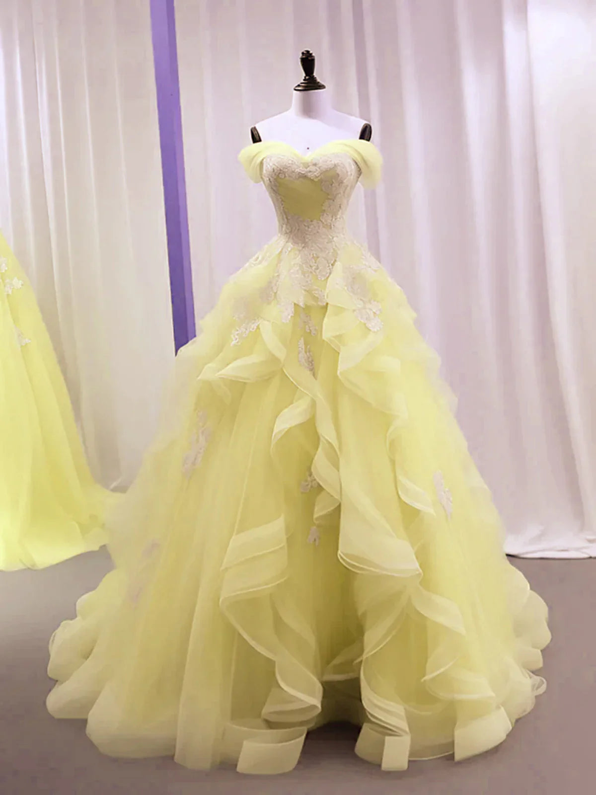 Yellow Tulle with Lace Sweetheart Long Formal Dress, Yellow Tulle Prom Dress HZ1024