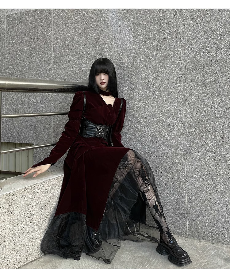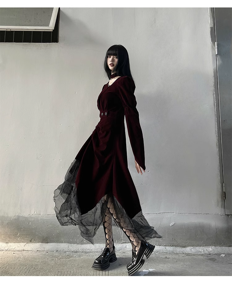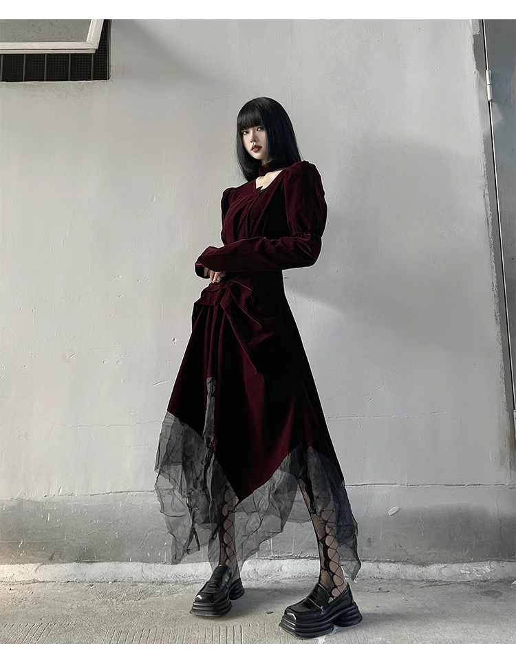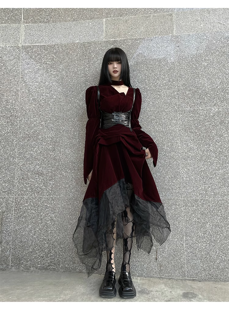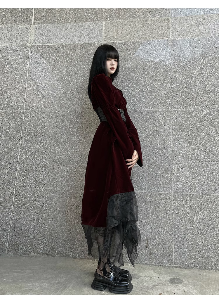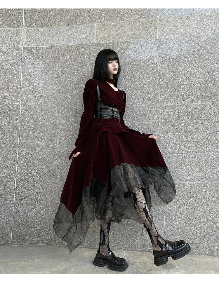 Elegant Fashion Red Velvet Irregular Dress Edge Design Gothic style party High-waisted Long-sleeved Dress HZ1024
