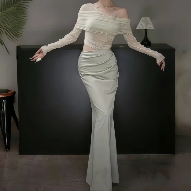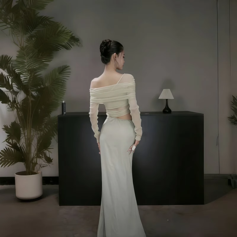 New Fashion Light Green Irregular One-shoulder Style Mesh Long-sleeved Dress HZ1024