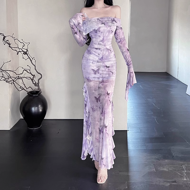 Women Elegant Mesh Butterfly Print Lavender Slim Long-sleeved Dress HZ1024
