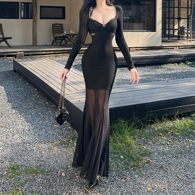 Women Simple Elegant Black Mesh Long-sleeved Dress HZ1024