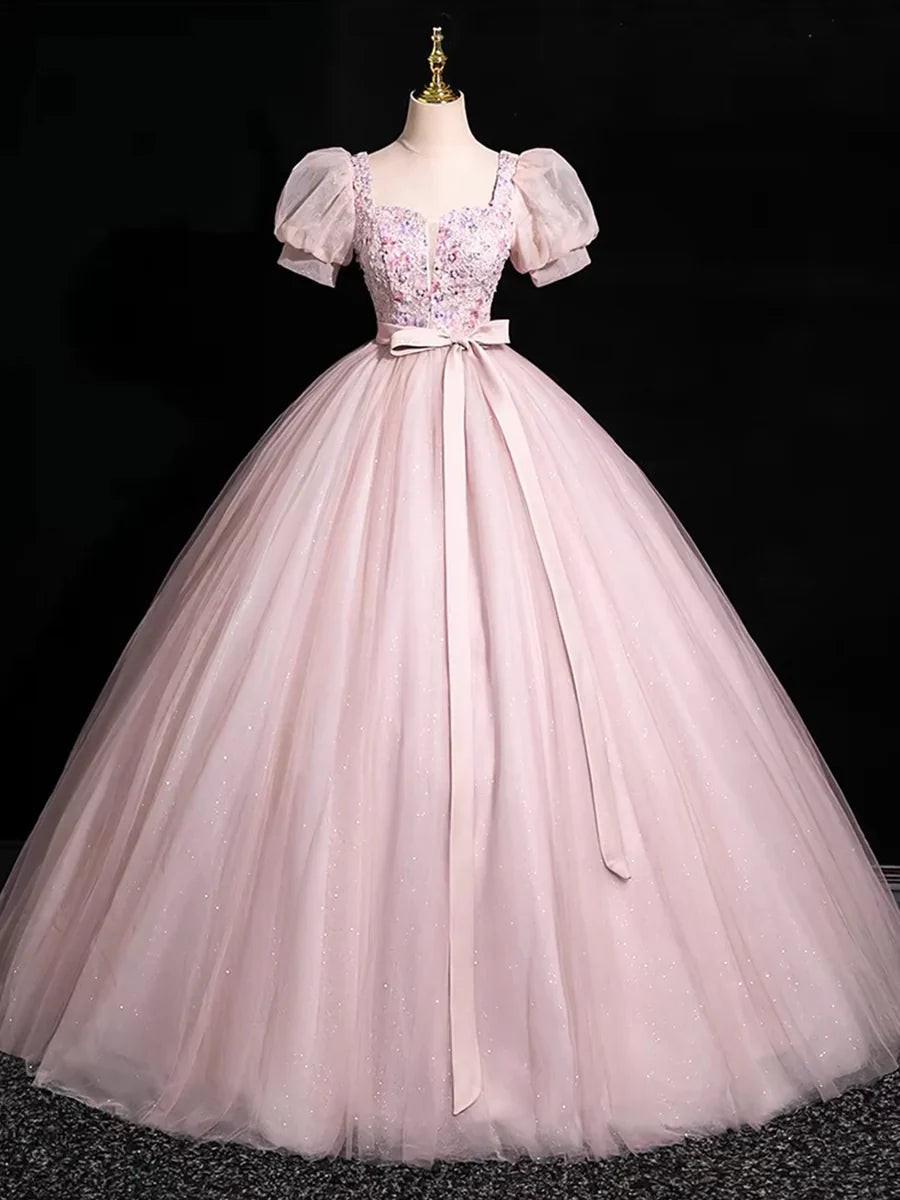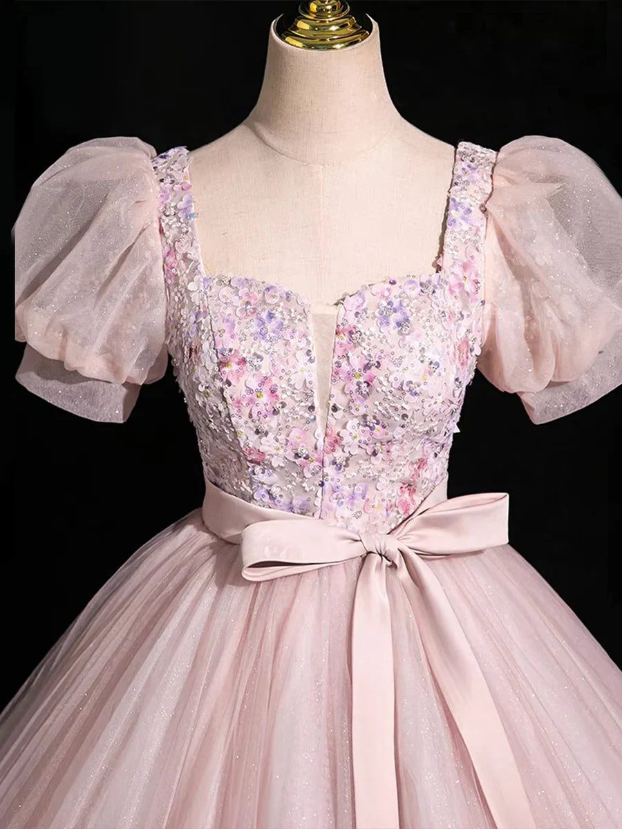 Beautiful Floral Tulle Floor Length Prom Dress, Pink A-Line Short Sleeve Evening Dress HZ1024