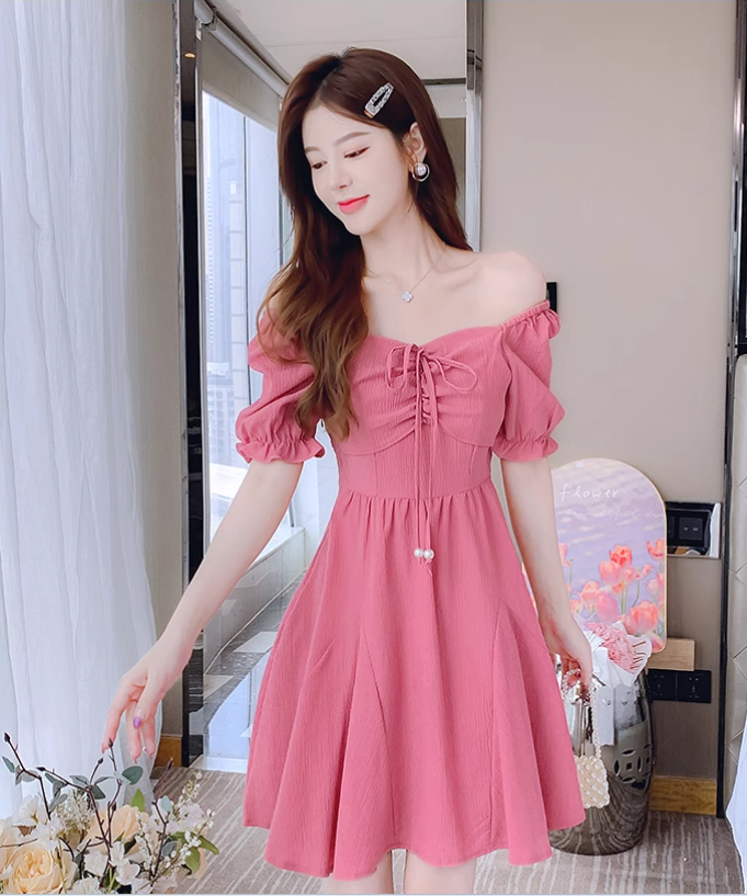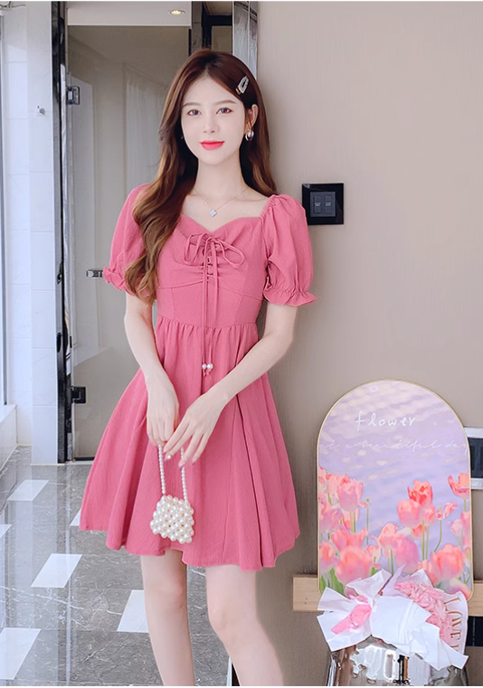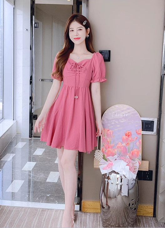 New Fashion Short Sleeves Rose Pink Design A-Line Dress HZ1024