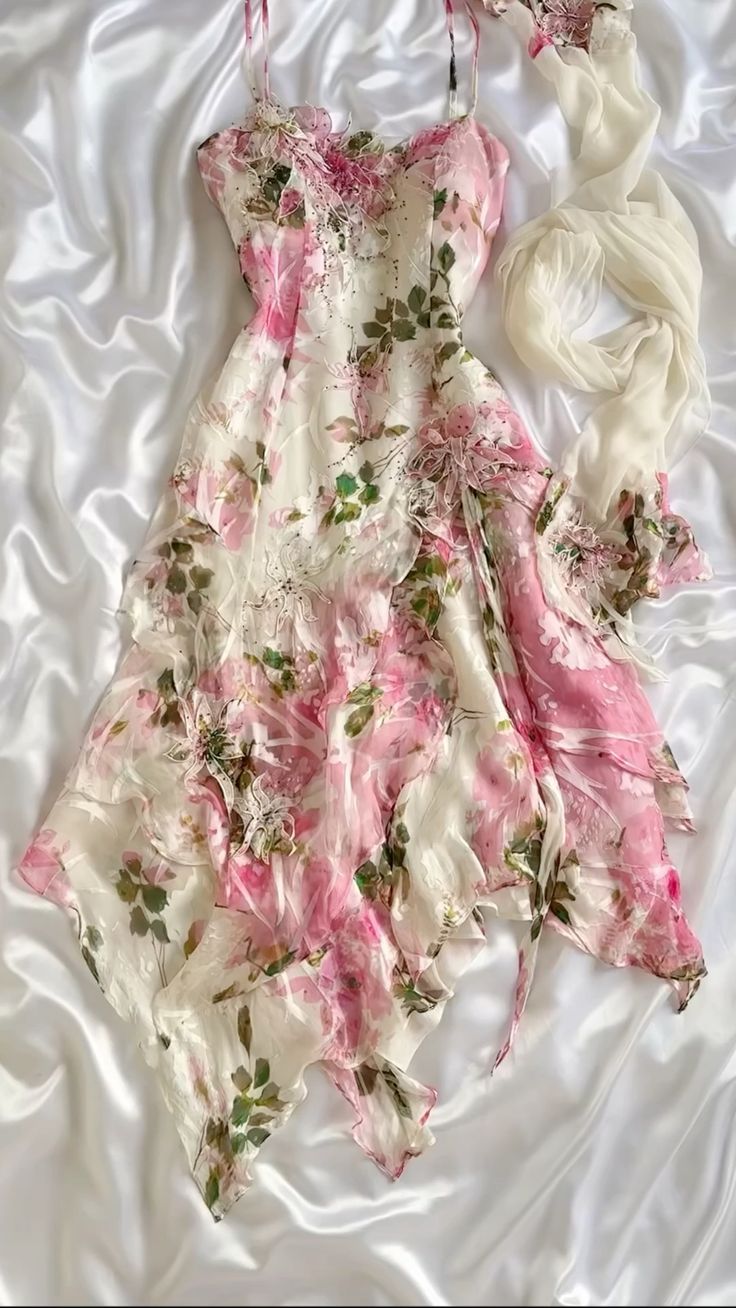 Sexy Pink A-line Printed Strap Chiffon Short Prom Gown Party Dress HZ1024