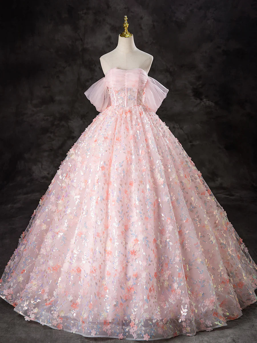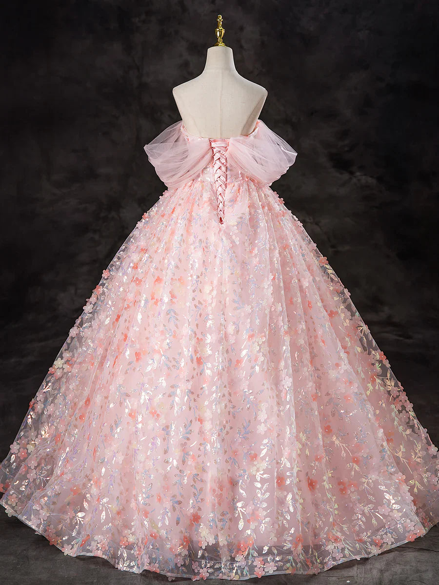 A-Line Pink Tulle Flowers Long Prom Dress, Beautiful Off the Shoulder Evening Party Dress HZ1024