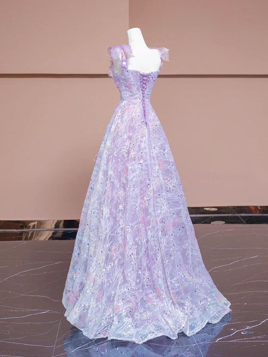 A-Line Purple Tulle Flowers Long Prom Dress, Beautiful Evening Party Dress HZ1024