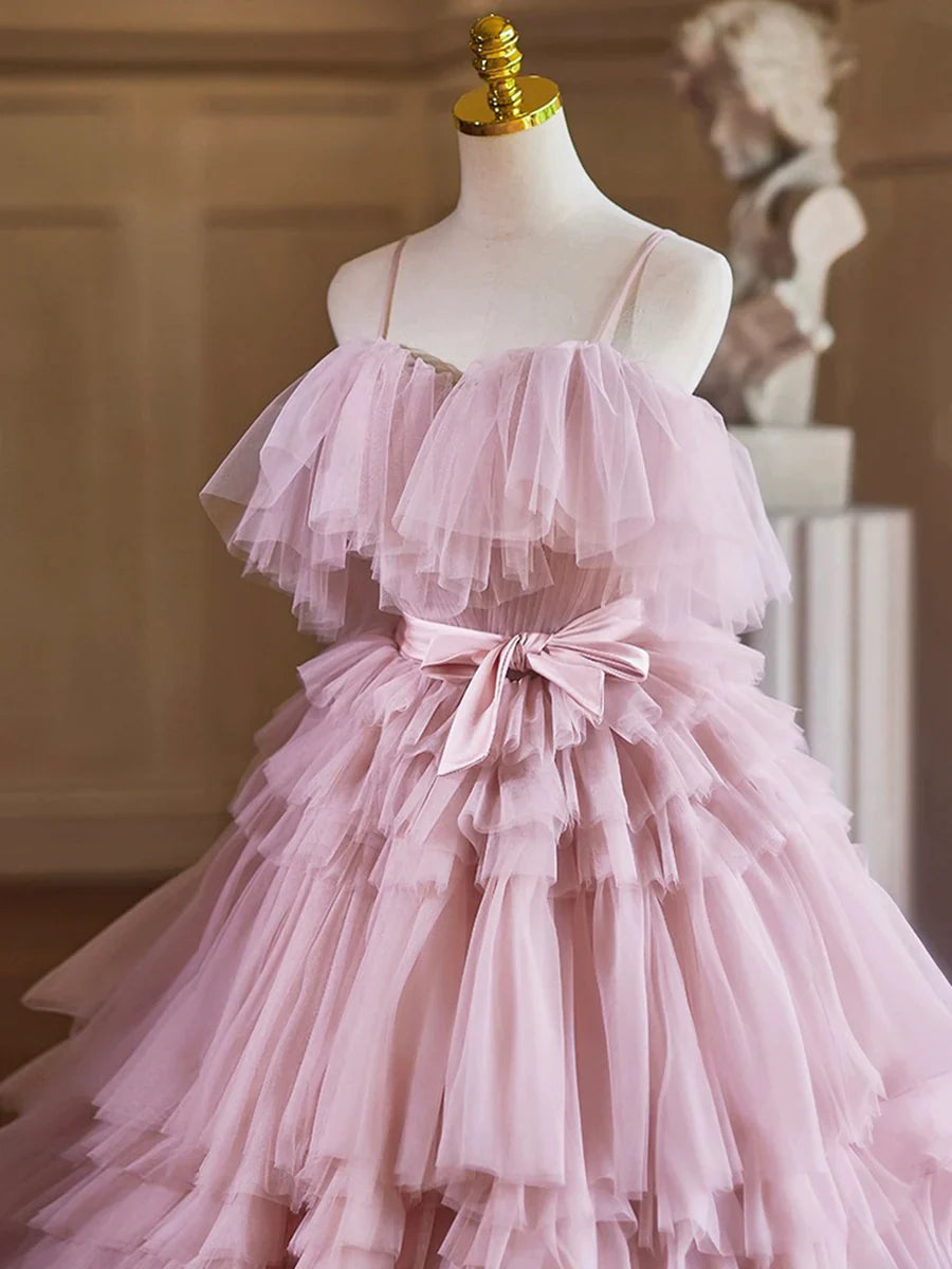 A-Line Spaghetti Strap Layers Tulle Long Party Dress, Pink Prom Dress Formal Gown HZ1024