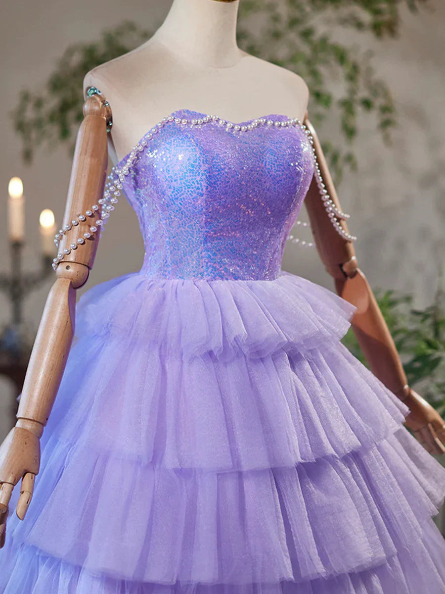 A-Line Tulle and Sequins Short Party Dress, Lavender Strapless Evening Dress HZ1024