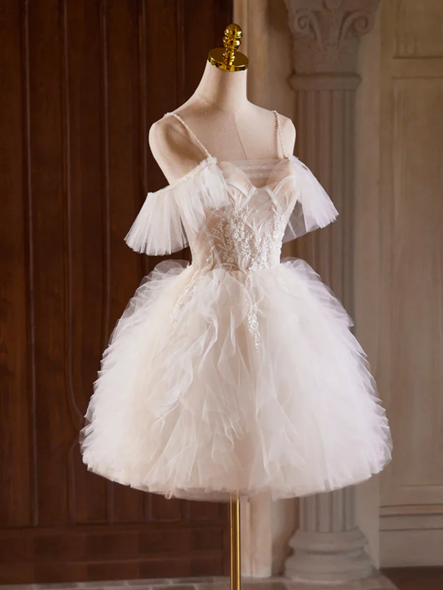 A-Line Tulle Layers Short Prom Dress, Light Champagne Spaghetti Strap Party Dress HZ1024