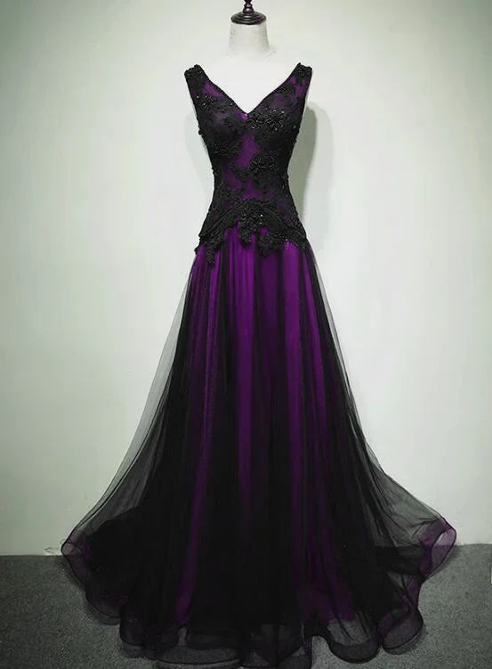 Black And Purple Tulle V-Neckline Beaded Prom Dress, Long Tulle Formal Dress Evening Dress HZ1024
