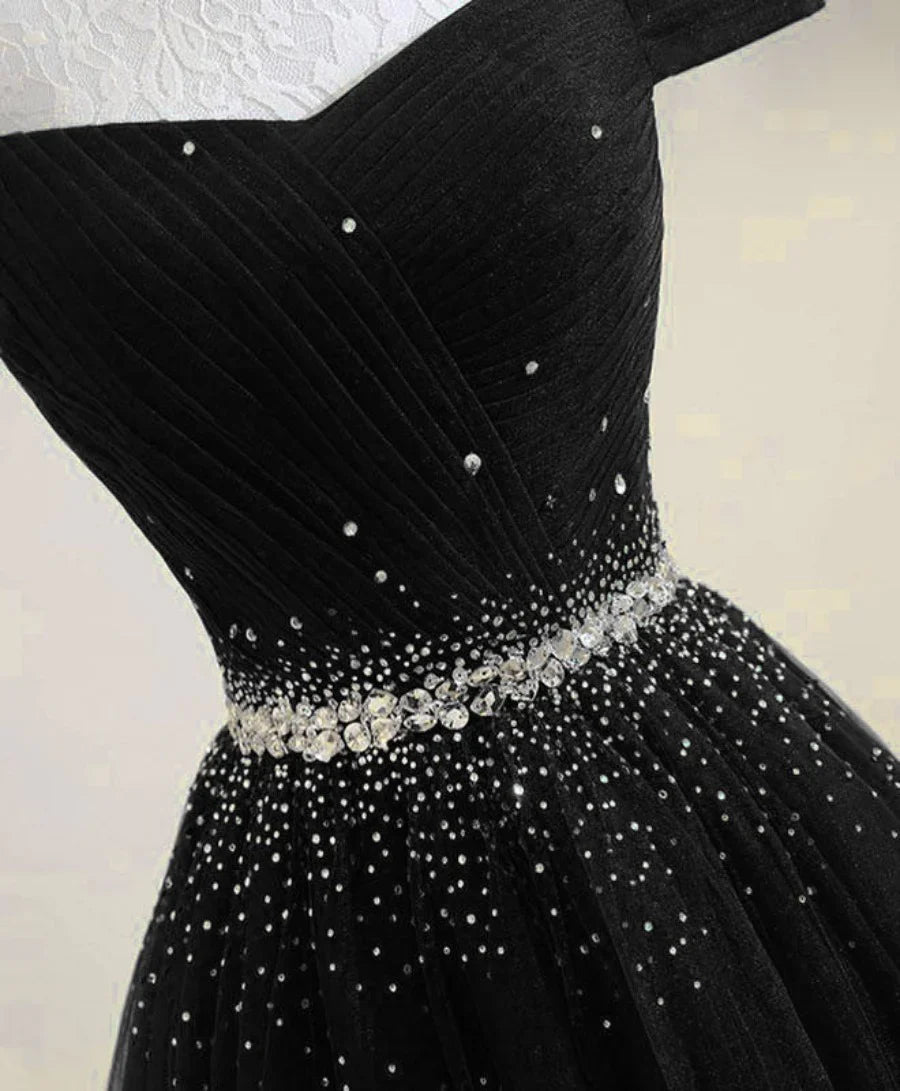 Black Beaded Off Shoulder Tulle Long Party Dress, Black A-line Prom Dress HZ1024