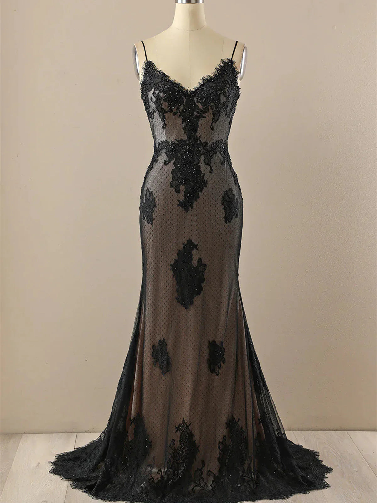 Black Mermaid Lace Straps Evening Dress Party Dress, Black Long Prom Dress HZ1024