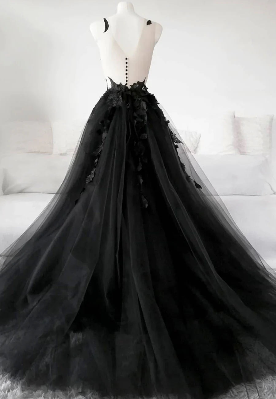 Black Tulle Lace Long Prom Dress, Black Formal Graduation Dress HZ1024