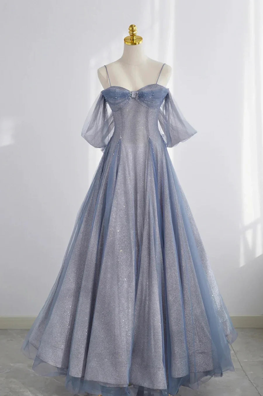 Blue Spaghetti Strap Tulle Long Prom Dress, A-Line Formal Dress HZ1024