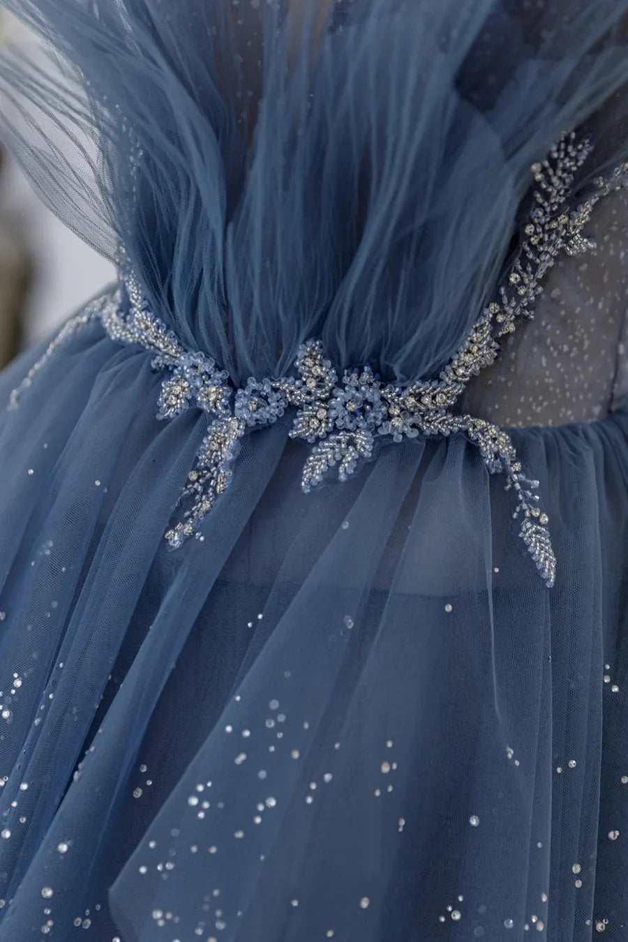 Blue Tulle Layers Straps Beaded Long Prom Dresses, A-Line Evening Dresses HZ1024