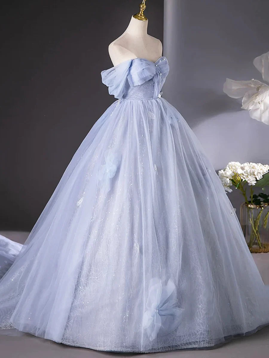 Blue Tulle Long A-Line Prom Dress Party Dress, Beautiful Off the Shoulder Blue Evening Dress HZ1024
