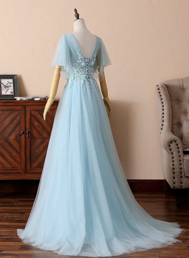 Blue V-Neck Lace Long Prom Dresses, A-Line Evening Dresses HZ1024
