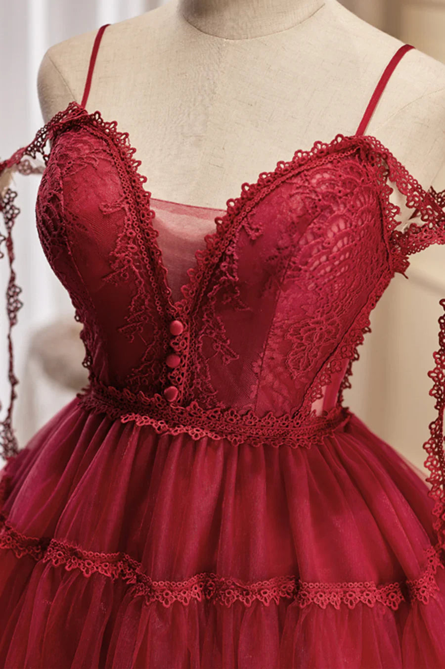 Burgundy Lace Short A-line Prom Dress, Cute Spaghetti Strap Party Dress HZ1024
