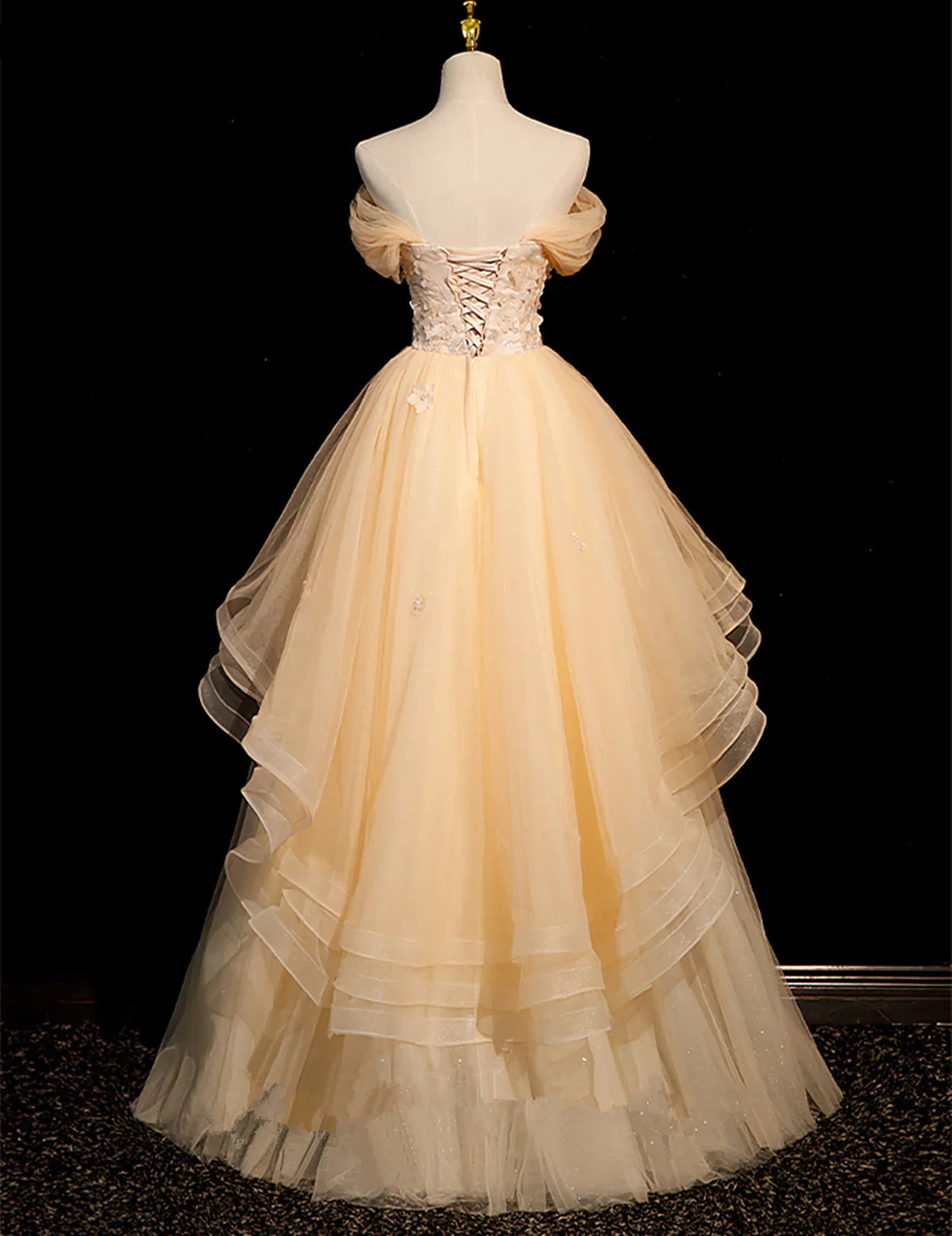 Champagne A-line Tulle Layers with Lace Party Dress, Long Tulle Formal Dress Prom Dress HZ1024