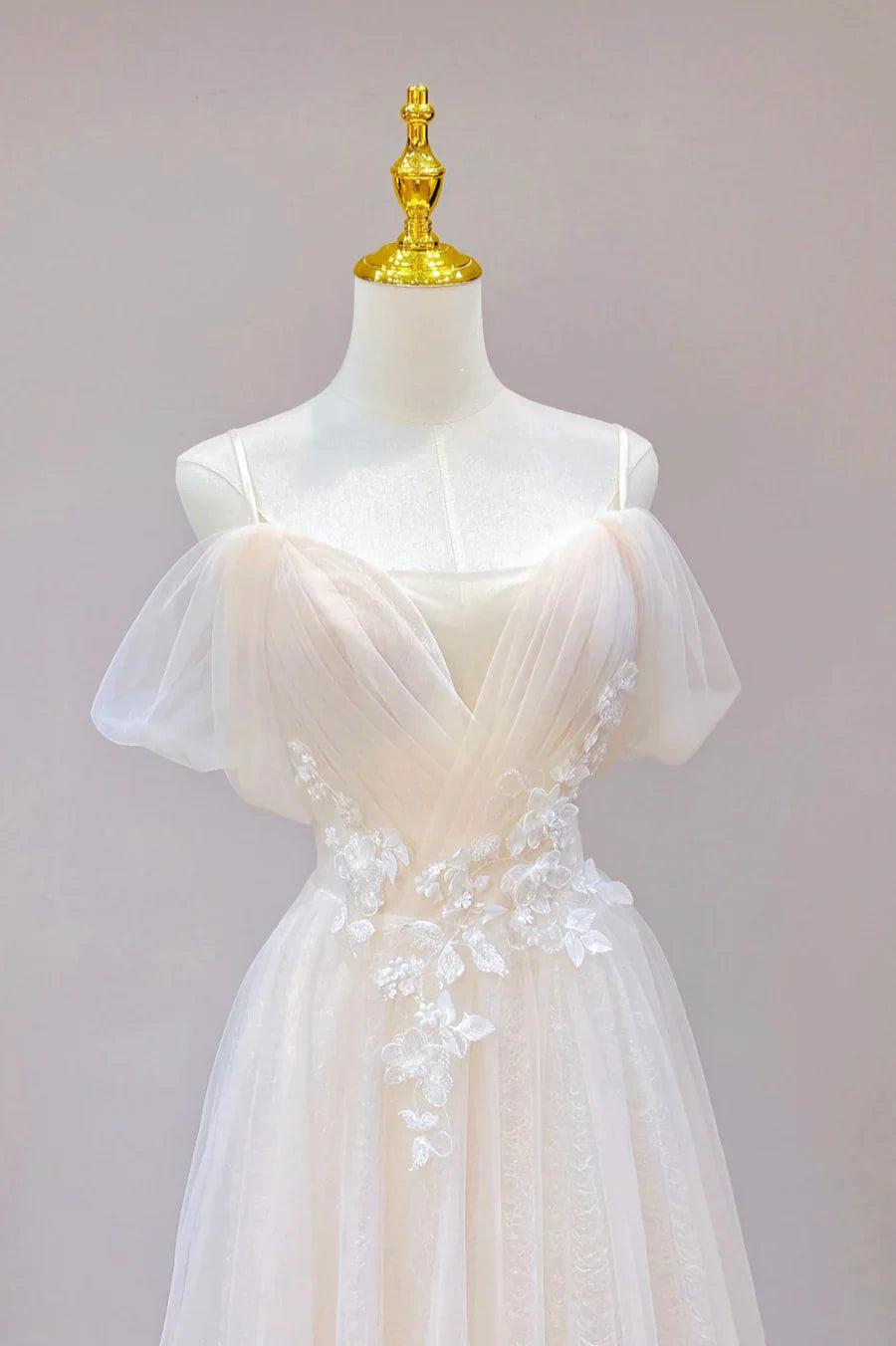 Champagne Tulle Long Prom Dress, Lovely Lace Formal Evening Dress HZ1024