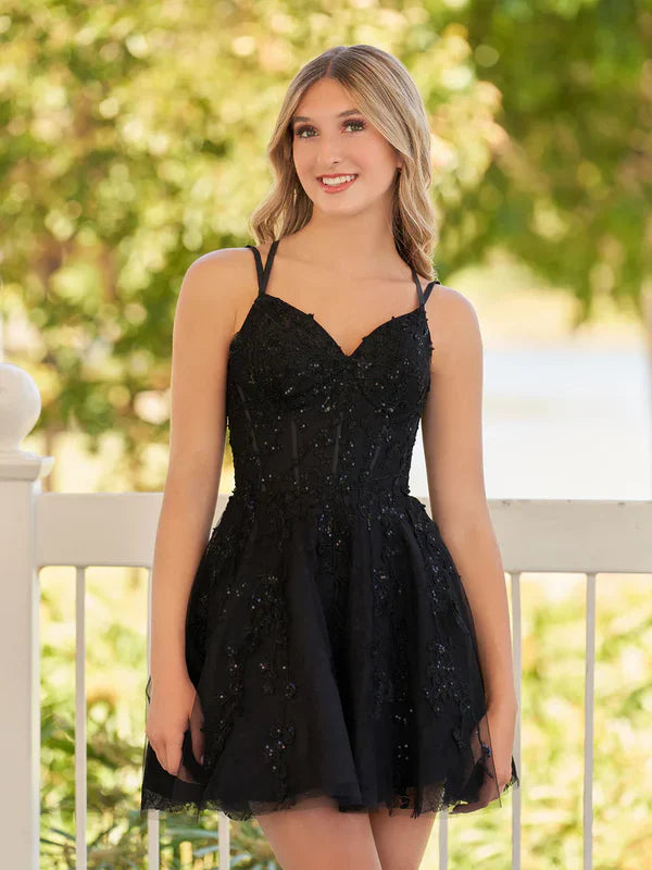 Charming Black Lace Design A-line Lace-up Spaghetti Strap Homecoming Dress HZ1024