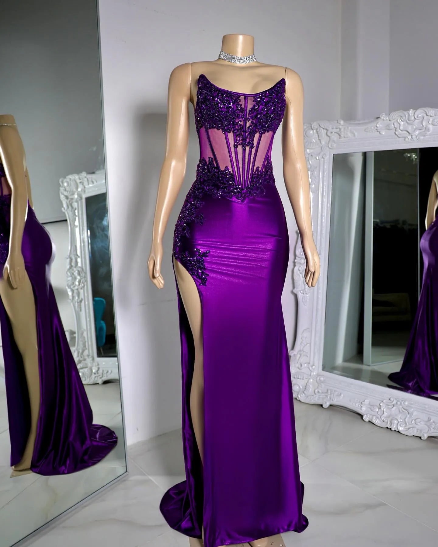 Charming Purple Off Shoulder Lace Silk Satin High Slit Mermaid Prom Dress Evening Dress HZ1024