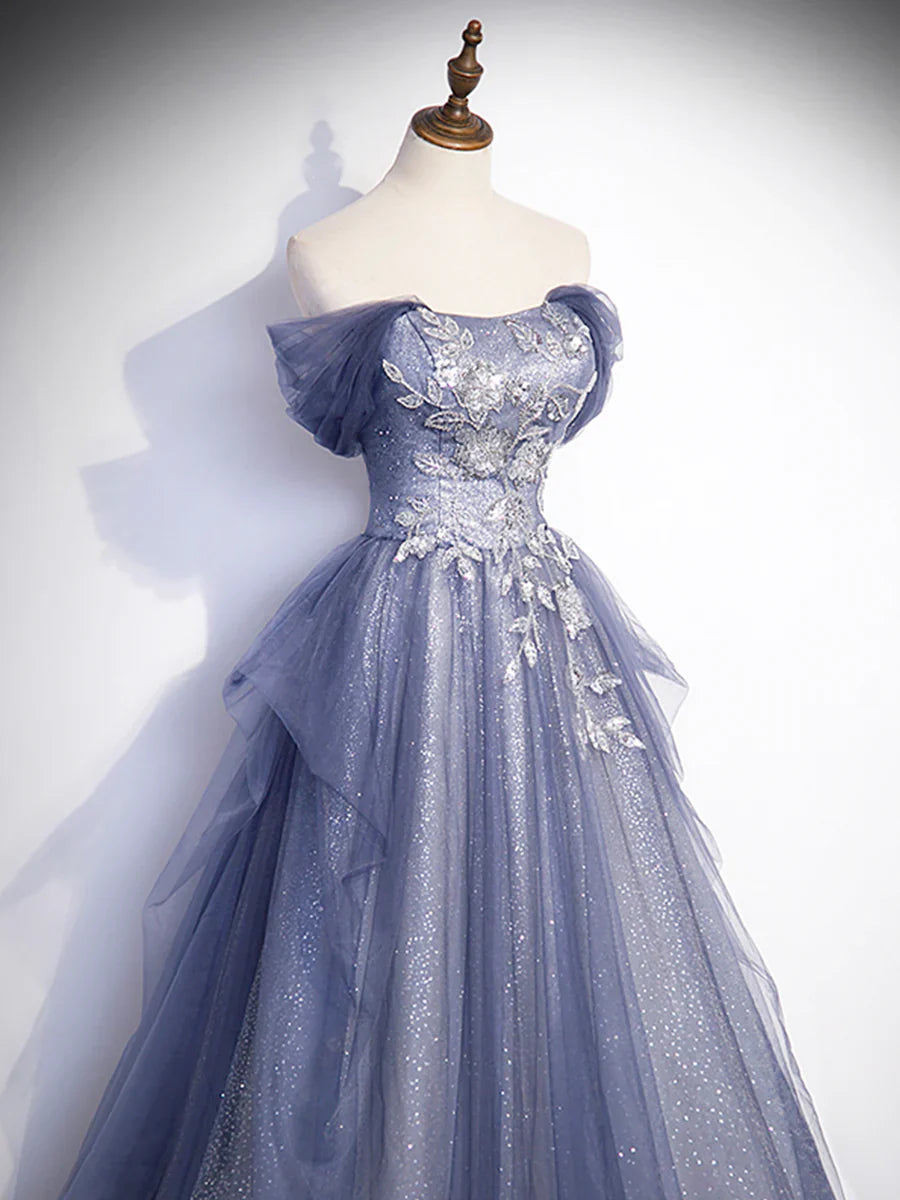 Charming Tulle Sequins A-Line Prom Dresses, Off the Shoulder Floor-Length Formal Dresses HZ1024