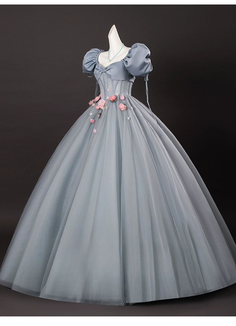 Chic Dusty Blue Sweet 16 Quinceanera 3D Flowers A-Line Puffy Sleeves Evening Dress Long Ball Gown HZ1024