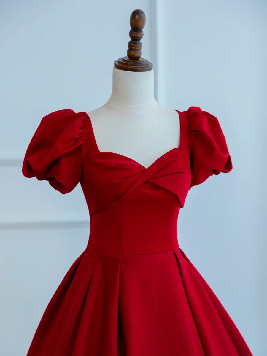 Dark Red Satin Long Prom Dress, A-Line Short Sleeve Evening Party Dress HZ1024