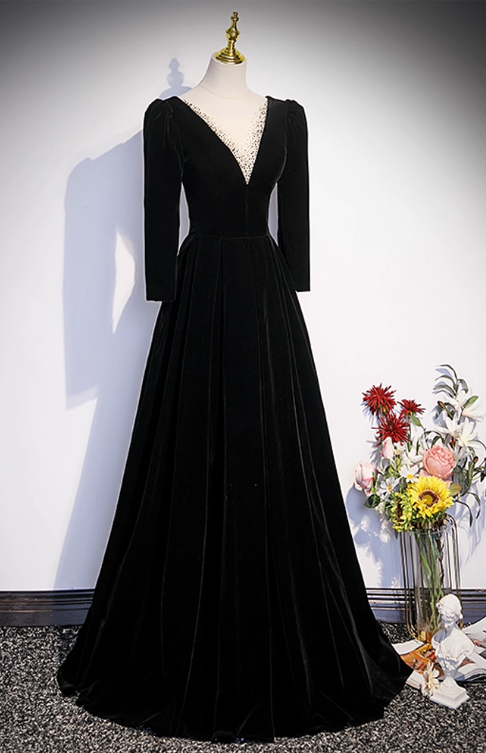 Elegant Black Velvet Beaded A-Line Evening Gown Long-sleeved V-neck Party Dress Long Formal Dress HZ1024