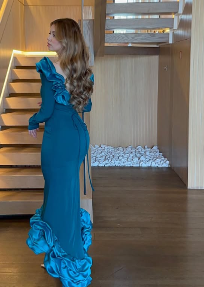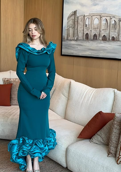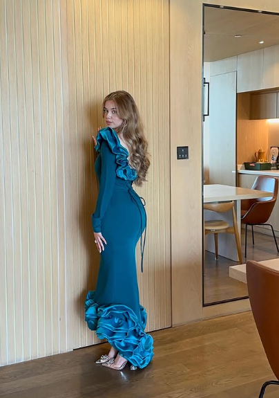 Elegant Blue Mermaid Long Sleeve Irregular Skirt Ball Gown Evening Dress HZ1024