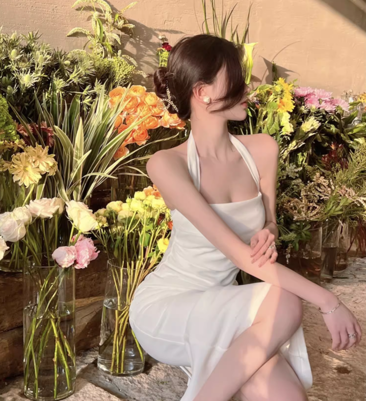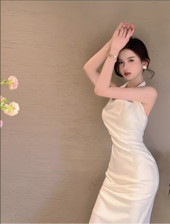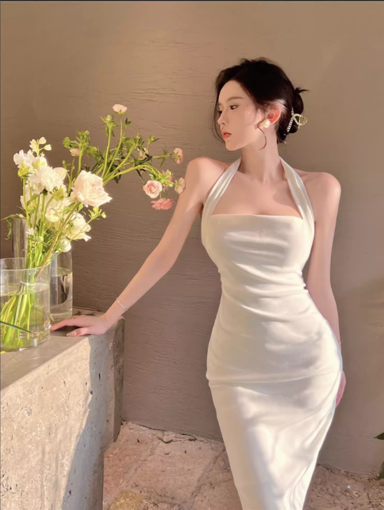 Elegant Design White A-Line Slim Midi Halter Dress HZ1024