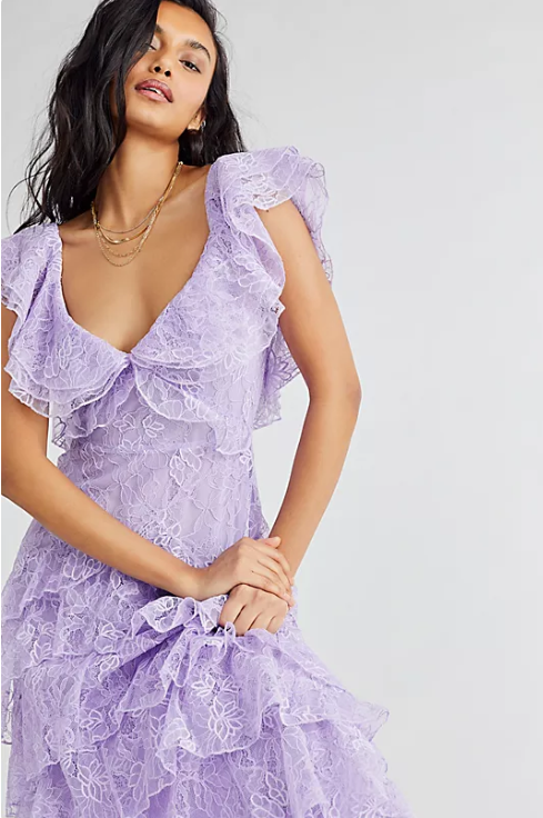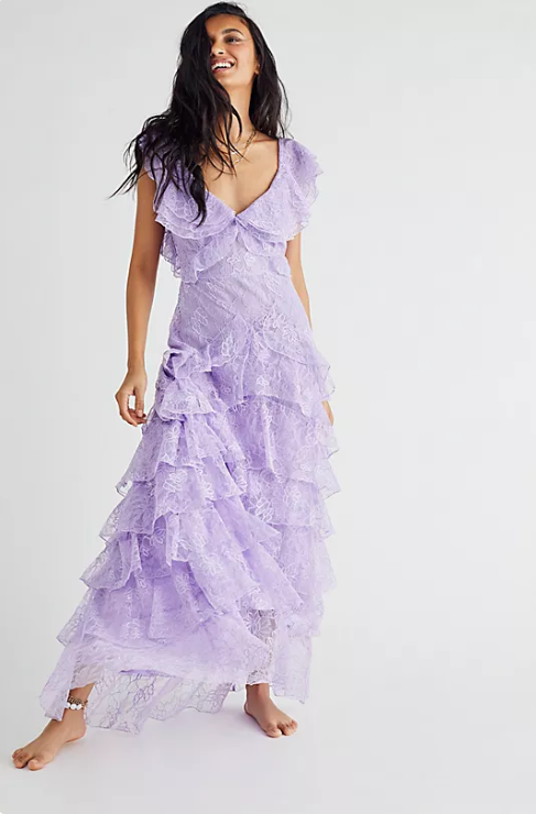 Elegant Lilac V-neck Prom Dress Lace Sheath Evening Gown Long Party Dress Tiered Formal Dress HZ1024