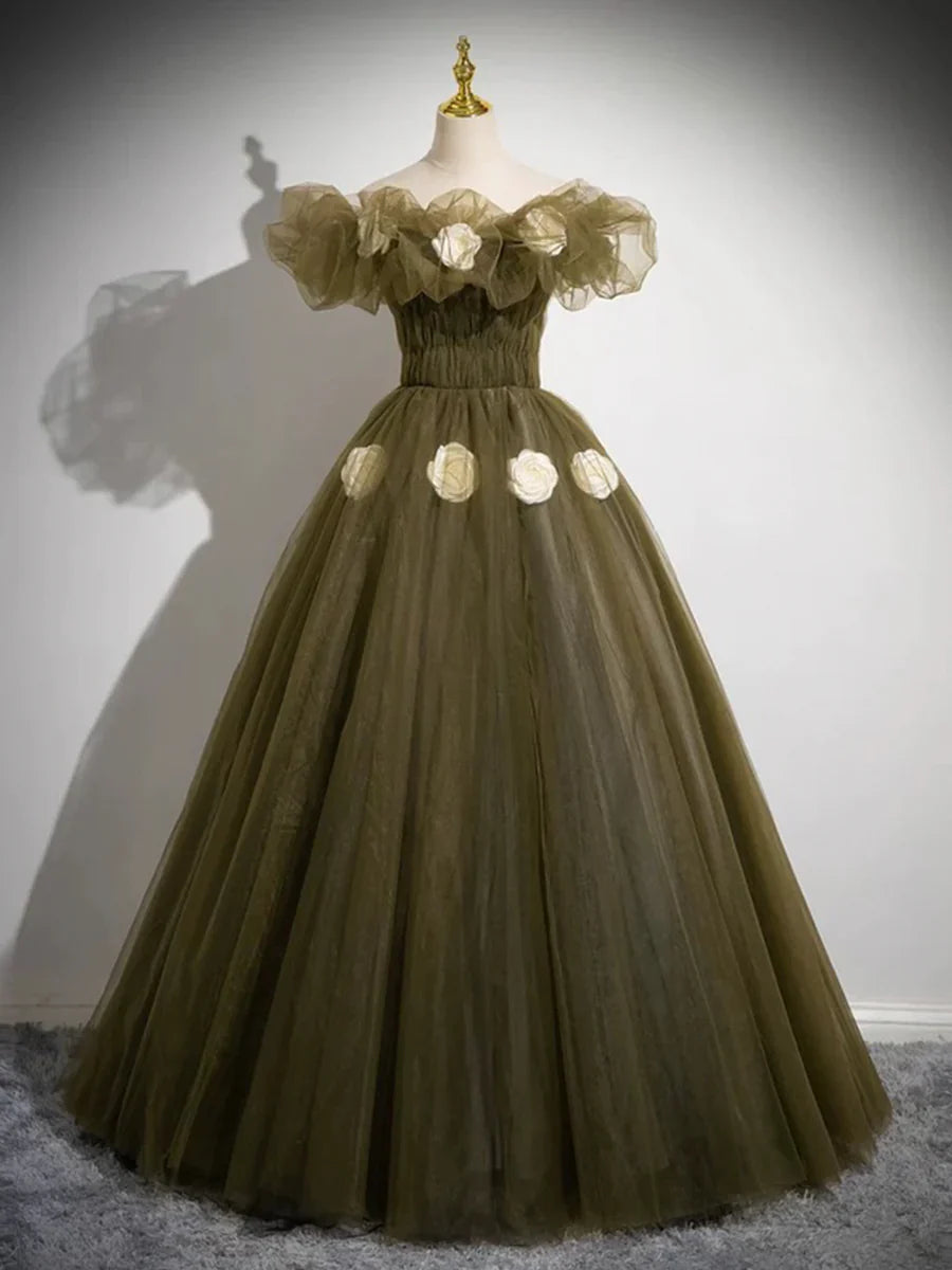 Elegant Off the Shoulder Floor Length Prom Dress, Green A-Line Tulle Formal Party Dress HZ1024