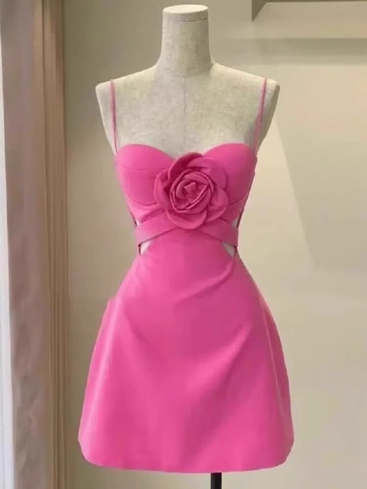 Elegant Rose Pink Sweetheart 3D Flower Design A-line Spaghetti Strap Party Dress Homecoming Dress HZ1024
