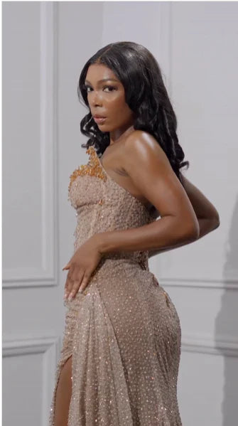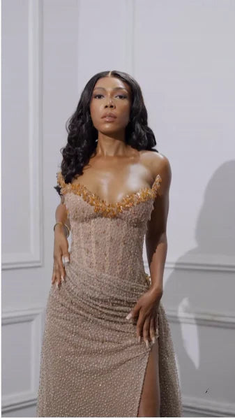 Enchanting Shiny Champagne Beaded Strapless Slit Prom Dress Evening Dress HZ1024