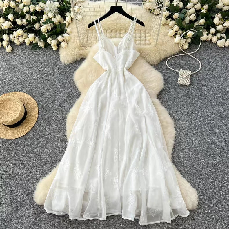 Fashion French High Sense V-neck High Waist Slimming Embroidery White Spaghetti Strap Dress HZ1024
