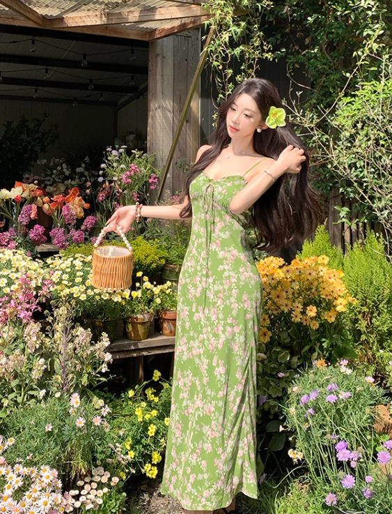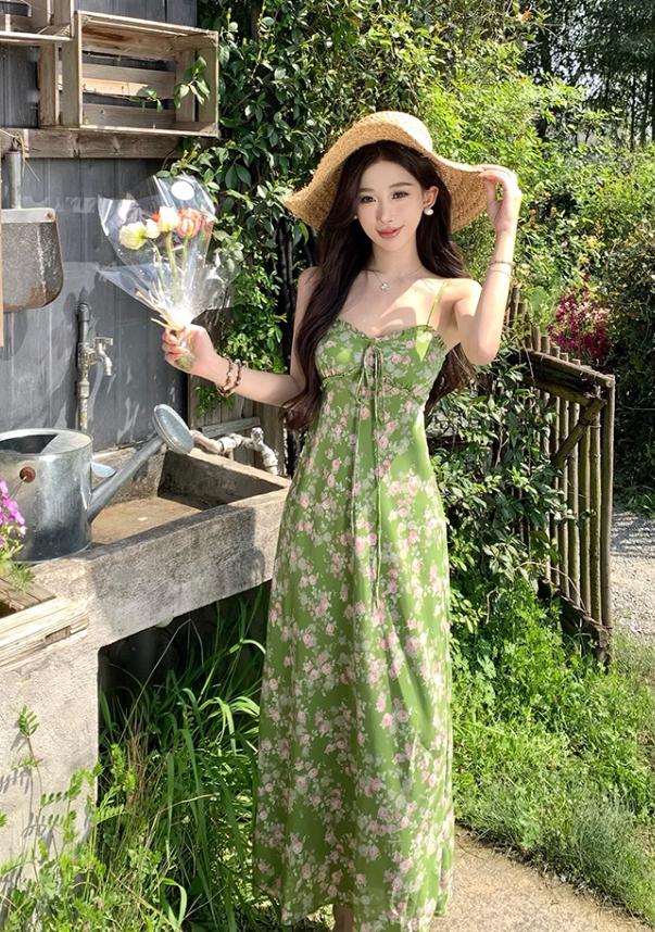 Fashion Green Floral Design Elegant A-line Spaghetti Strap Dress HZ1024