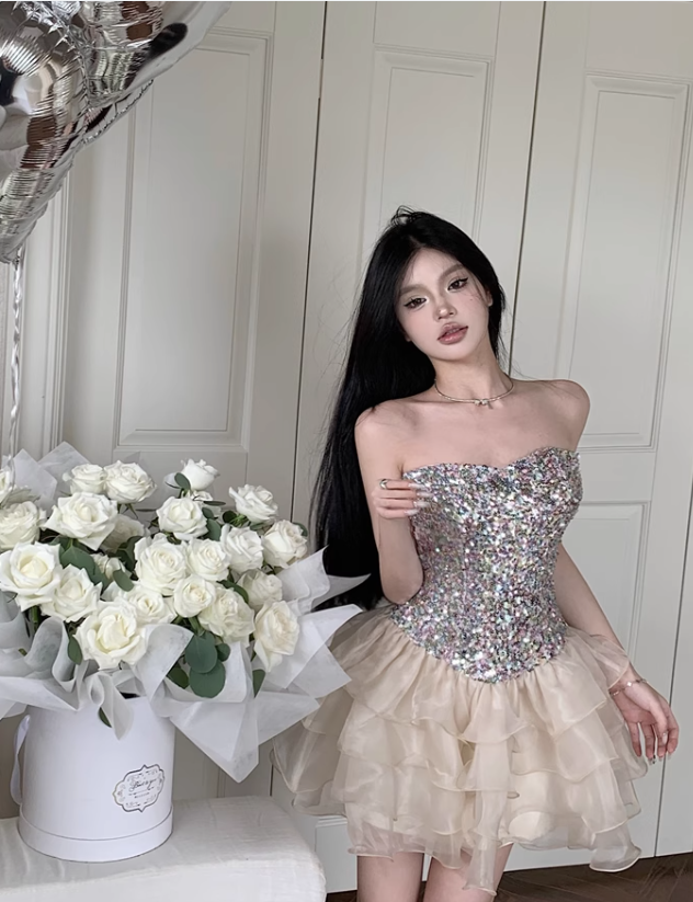 Fashion Sparkly Sequin Tulle Design A-line Strapless Tiered Homecoming Dress HZ1024