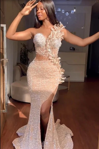 Gorgeous Strapless Prom Dress Glittering Beaded Evening Gown High Slit Party Dress Trailing Long Formal Dress HZ1024