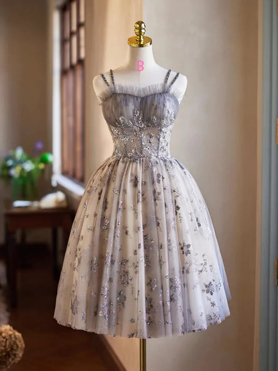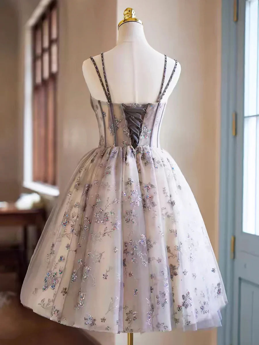 Gray Tulle Sequins Short Party Dress, Cute Spaghetti Strap Backless Evening Dress HZ1024