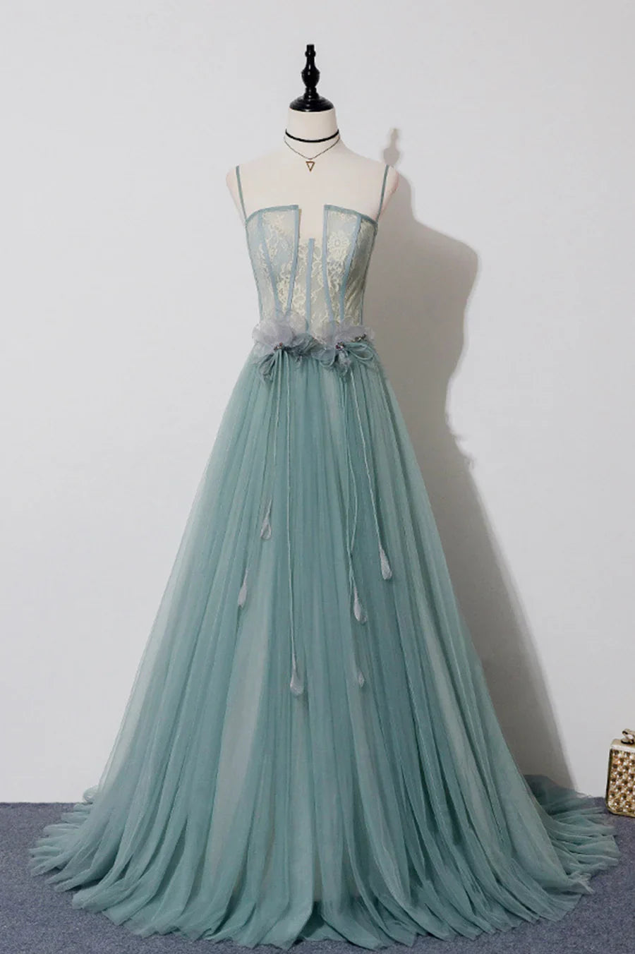 Green Lovely Tulle Straps Long A-Line Prom Dresses, Green Evening Dresses HZ1024