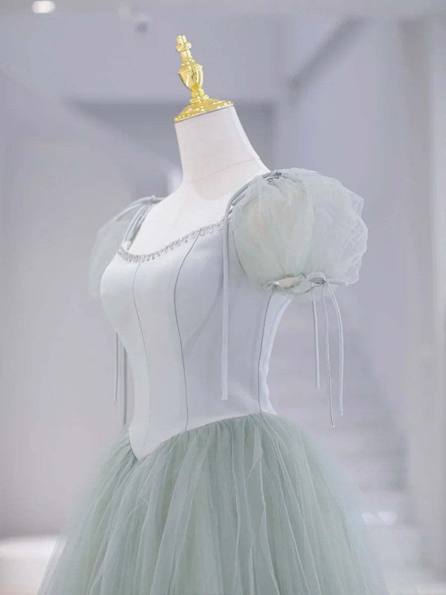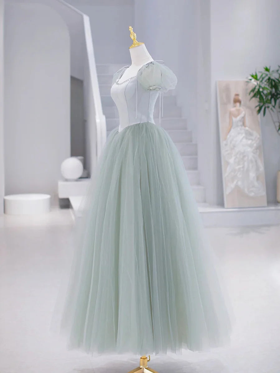 Green Tulle Floor Length Prom Dress, Green Short Sleeve Evening Party Dress HZ1024