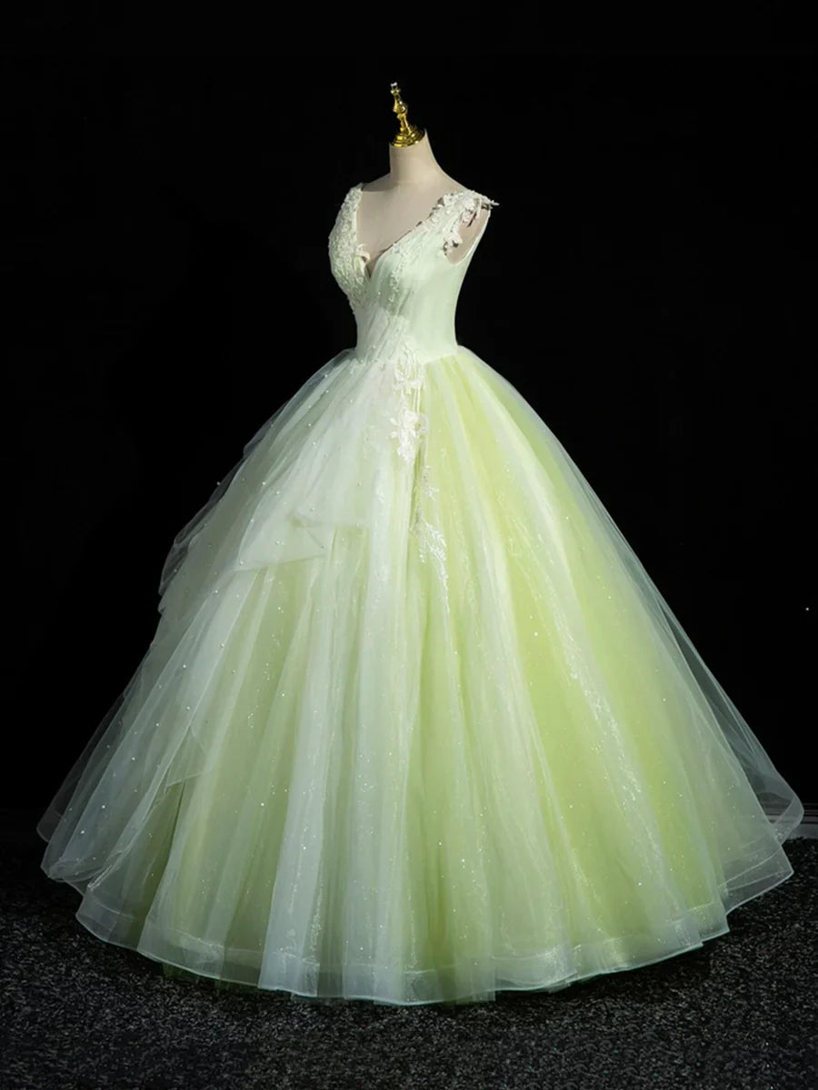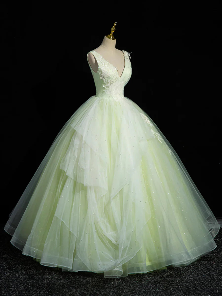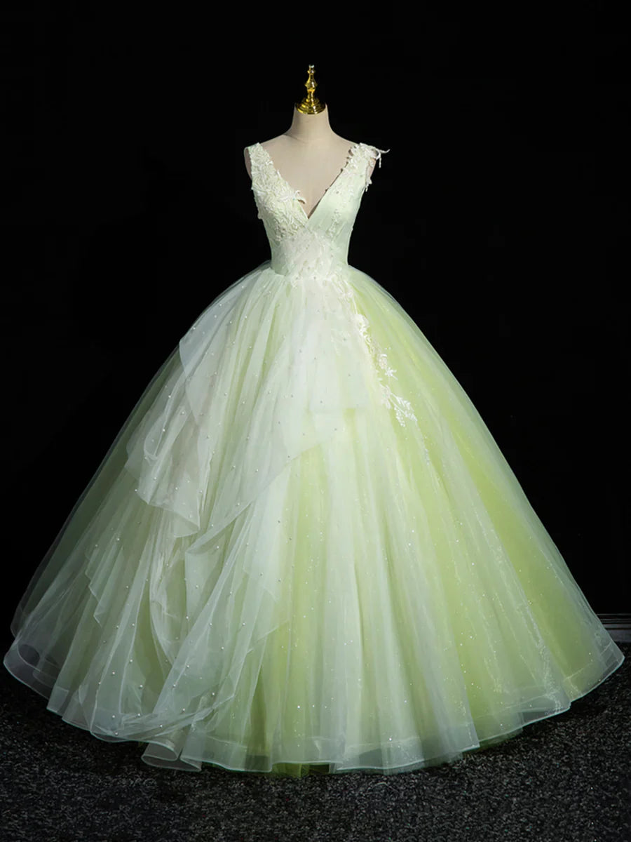 Green V-Neck Tulle Lace Long Prom Dress, A-Line Sleeveless Evening Dress HZ1024